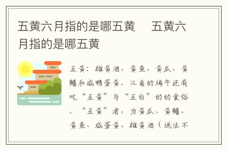 五黄:雄黄酒、黄鱼、黄瓜、黄鳝和咸鸭蛋黄。江南的端午还有吃“五黄”与“五白”的的食俗。“五黄”者,为黄瓜、黄鳝、黄鱼、咸蛋黄、雄黄酒(说法不一,有人将黄梅、黄泥螺也作五黄之一。因雄黄有毒,现今将雄黄入白酒内饮者已少见,今多见以黄酒替代雄黄酒)。“五白”者,为白切肉、白蒜头、白斩鸡、白豆腐、茭白。端午食“五黄”与“五白”的菜,可清热降火,健脾和胃。
