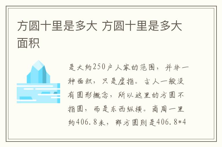 是大约250户人家的范围,并非一种面积,只是虚指。古人一般没有圆形概念,所以这里的方圆不指圆,而是东西纵横。商周一里约406.8米,那方圆则是406.8*406.8=165486.24平方米。秦汉一里约415.8米,那方圆则是415.8*415.8=172889.64平方米。隋唐一里约540米,那方圆则是540*540=291600平方米。