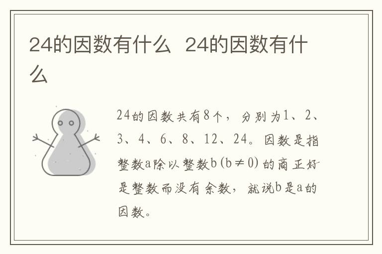 24的因数有什么 24的因数有什么 知识分享 3月25日 编辑 童画 取消关注 关注 私信 24的因数共有8个,分别为1、2、3、4、6、8、12、24。 因数是指整数a除以整数b(b≠0)的商正好是整数而没有余数,我们就说b是a的因数。小学数学中定义:假如a×b=c,a、b、c都是整数,那么我们称a和b就是c的因数。需要注意的是,唯有被除数、除数、商皆为整数,余数为零时,此关系才成立。 No related posts. 本文内容由互联网用户自发贡献,该文观点仅代表作者本人。本站仅提供信息存储空间服务,不拥有所有权,不承担相关法律责任。如发现本站有涉嫌抄袭侵权/违法违规的内容, 请发送邮件至 2245678901@qq.com 举报,一经查实,本站将立刻删除。 给TA打赏 共{{data.count}}人 人已打赏