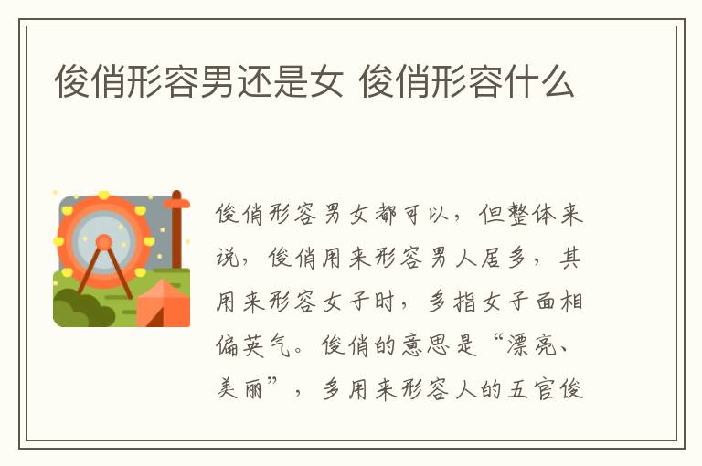 俊俏形容男女都可以,但整体来说,俊俏用来形容男人居多,其用来形容女子时,多指女子面相偏英气。俊俏的意思是“漂亮、美丽”,多用来形容人的五官俊朗。与“俊俏”意思相似的词语有:绚丽、奇丽、秀美、姣美、秀丽、俏丽、秀气、艳丽、秀雅、英俊、姣好、俊秀等。元·王实甫《西厢记》第一本第四折:“扭捏着身子儿百般做作,来往向人前卖弄俊俏。”