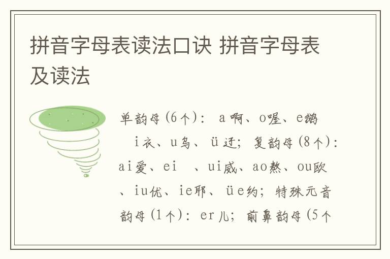 1、单韵母(6个):ɑ啊、o喔、e鹅、i衣、u乌、ü迂;