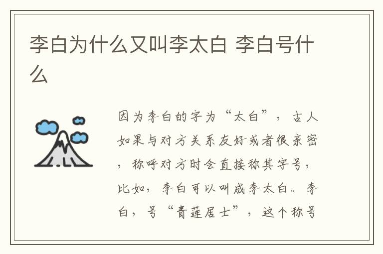 因为李白的字为“太白”,古人如果与对方关系友好或者很亲密,称呼对方时会直接称其字号,比如,李白可以叫成李太白。李白,号“青莲居士”,这个称号源于《维摩诘经》之“青莲”佛典,表明了李白尊崇佛教,以及向往维摩诘的生活模式。“青莲居士”是李白内心佛教情怀之外的身份认同。