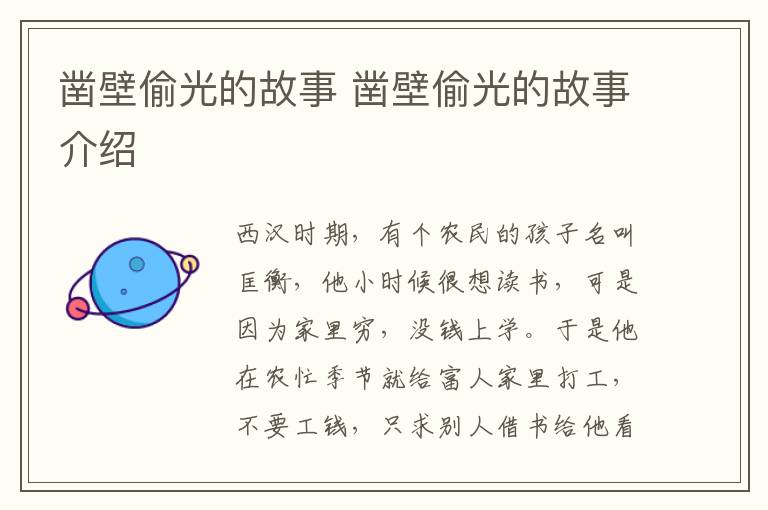 他一天到晚都在地里干活,只有中午休息时,才有时间看书。常常一本书要十天半个月才能够读完。匡衡很着急,他心想:白天我在地里干活,没有时间看书,我应该多利用晚上的时间看书。可是家里穷,买不起点灯的油。