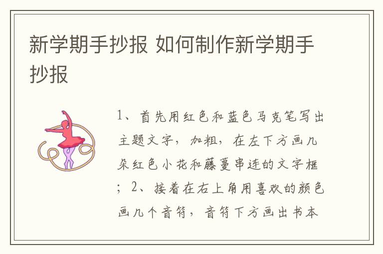 新学期手抄报 如何制作新学期手抄报 知识分享 3月10日 编辑 童画 取消关注 关注 私信 1、首先用红色和蓝色马克笔写出主题文字,加粗,在左下方画几朵红色小花和藤蔓串连的文字框。 2、接着在右上角用喜欢的颜色画几个音符,音符下方画出书本形状的文字框,再在书本下方画出一片绿色的草坪和红色的花。 3、然后在空白处用不同颜色的画出点缀的小星星,最后画出写作线,手抄报就完成啦。 No related posts. 本文内容由互联网用户自发贡献,该文观点仅代表作者本人。本站仅提供信息存储空间服务,不拥有所有权,不承担相关法律责任。如发现本站有涉嫌抄袭侵权/违法违规的内容, 请发送邮件至 2245678901@qq.com 举报,一经查实,本站将立刻删除。 给TA打赏 共{{data.count}}人 人已打赏