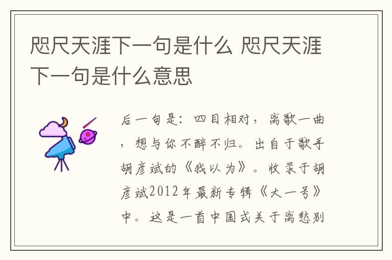 后一句是:四目相对,离歌一曲,想与你不醉不归。出自于歌手胡彦斌的《我以为》。收录于胡彦斌2012年最新专辑《大一号》中。这是一首中国式关于离愁别怨的情歌。这张专辑以传统的胡彦斌曲风和摇滚风格的混搭,给歌迷以眼前一亮。这是一首完全采用七十年代编曲方式写就的邓丽君式情歌。
