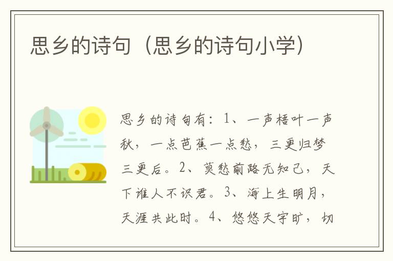 思乡的诗句有:1、一声梧叶一声秋,一点芭蕉一点愁,三更归梦三更后。2、莫愁前路无知己,天下谁人不识君。3、海上生明月,天涯共此时。4、悠悠天宇旷,切切故乡情。5、人言落日是天涯,望极天涯不见家。6、露从今夜白,月是故乡明。7、白日放歌须纵酒,青春作伴好还乡。8、今夜月明人尽望,不知秋思落谁家。