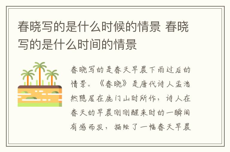 春晓写的是春天早晨下雨过后的情景。《春晓》是唐代诗人孟浩然隐居在鹿门山时所作,诗人在春天的早晨刚刚醒来时的一瞬间有感而发,描绘了一幅春天早晨绚丽的图景,抒发了诗人热爱春天、对大自然美好风光的喜爱。