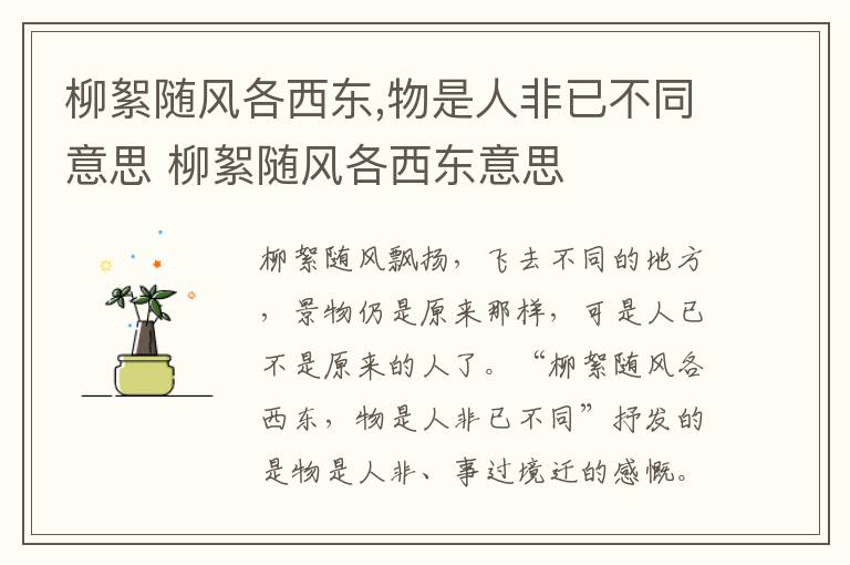 “柳絮随风各西东,物是人非已不同”的意思:柳絮随风飘扬,飞去不同的地方,景物仍是原来那样,可是人已不是原来的人了。“柳絮随风各西东,物是人非已不同”抒发的是物是人非、事过境迁的感慨。“物是人非”一词出自三国魏·曹丕《与吴质书》。