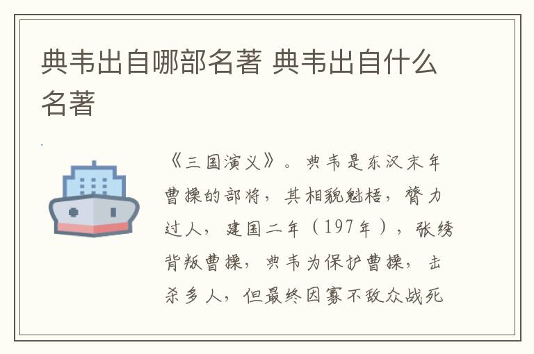 典韦出自哪部名著 典韦出自什么名著 知识分享 3月12日 编辑 童画 取消关注 关注 私信 典韦出自《三国演义》这部名著,典韦是东汉末年曹操的部将,其相貌魁梧,膂力过人,建国二年(197年),张绣背叛曹操,典韦为保护曹操,击杀多人,但最终因寡不敌众战死。 No related posts. 本文内容由互联网用户自发贡献,该文观点仅代表作者本人。本站仅提供信息存储空间服务,不拥有所有权,不承担相关法律责任。如发现本站有涉嫌抄袭侵权/违法违规的内容, 请发送邮件至 2245678901@qq.com 举报,一经查实,本站将立刻删除。 给TA打赏 共{{data.count}}人 人已打赏