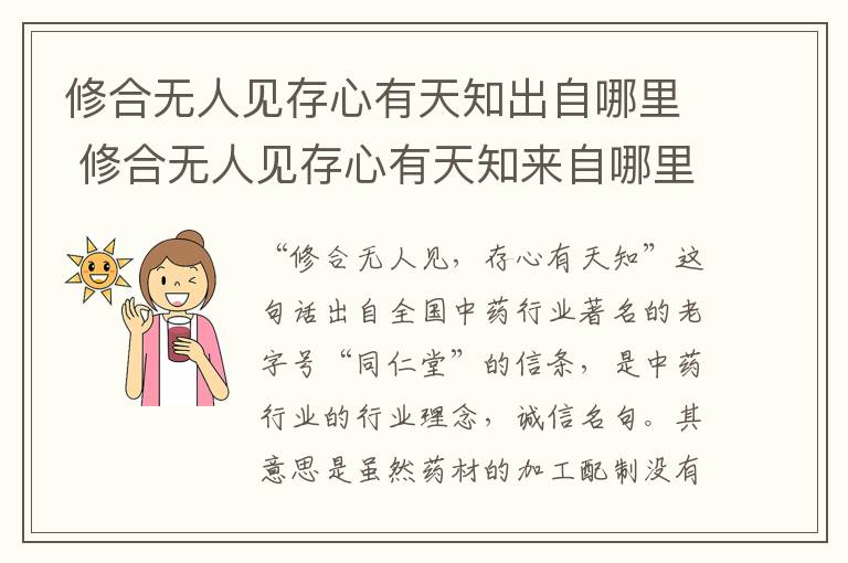 “修合无人见,存心有天知”这句话出自全国中药行业著名的老字号“同仁堂”的信条,是中药行业的行业理念,诚信名句。其意思是虽然药材的加工配制没有人监管,但是不要违背良心,因为所做的一切上天都是知道的。