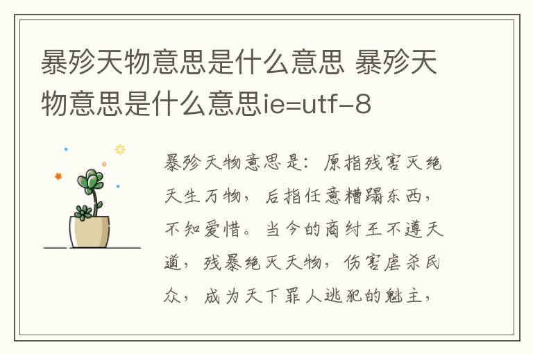 暴殄天物意思是:原指残害灭绝天生万物,后指任意糟蹋东西,不知爱惜。当今的商纣王不遵天道,残暴绝灭天物,伤害虐杀民众,成为天下罪人逃犯的魁主,商都成为罪人聚集的地方。那些学生,每餐饭菜都吃不完倒掉,真是暴殄天物。
