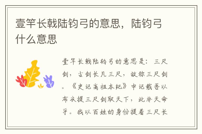 壹竿长戟陆钧弓的意思是:三尺剑,古剑长凡三尺,故称三尺剑。《史记高祖本纪》中记载吾以布衣提三尺剑取天下,此非天命乎。我以百姓的身份提着三尺长剑取得了天下,这难道不是天命吗。六钧弓是强弓。《登夏州城楼》诗好脱儒冠从校尉,一枝长戟六钧弓。