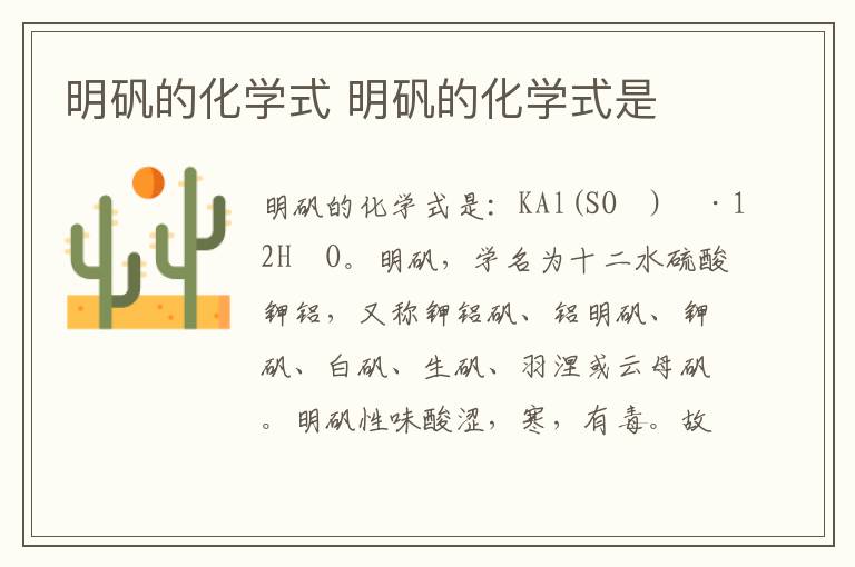 明矾的化学式是KAl(SO?)?·12H?O。明矾,它又称钾铝矾、铝明矾、钾矾、白矾、生矾、羽涅或云母矾,可以用作净化水质、鞣制皮革、当作发粉或者代替硫酸铝作凡拉明蓝防染剂。