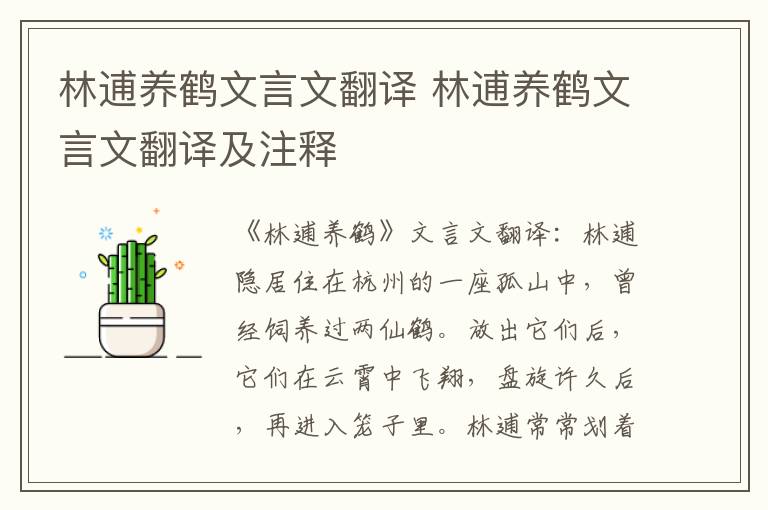 《林逋养鹤》文言文翻译:林逋隐居住在杭州的一座孤山中,曾经饲养过两仙鹤。放出它们后,它们在云霄中飞翔,盘旋许久后,再进入笼子里。林逋常常划着小船游览西湖周围的众多寺庙。(如果)有客人来到林逋的住所,就会有一个小童仆出来,开门迎接客人坐下,接着把笼子打开把鹤放出去。一会儿,林逋必定会划小船回来。原来他经常以鹤飞在空中盘旋作为(有客人来的)验证。