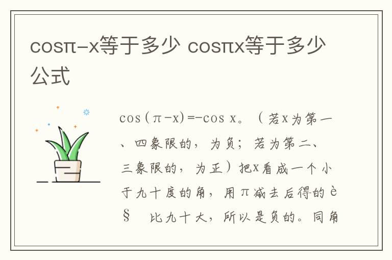 cos(π-x)=-cos x。(若x为第一、四象限的,为负;若为第二、三象限的,为正)把x看成一个小于九十度的角,用π减去后得的角比九十大,所以是负的。同角三角函数:sin^2(α)+cos^2(α)=1,tan^2(α)+1=sec^2(α),cot^2(α)+1=csc^2(α)。