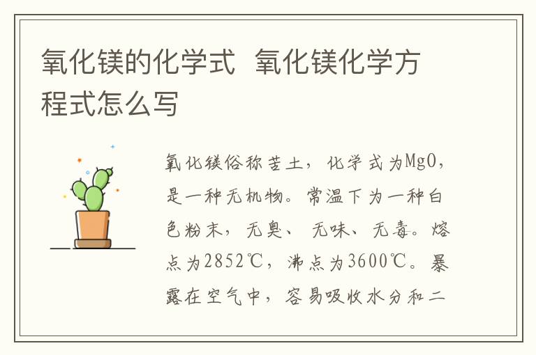氧化镁俗称苦土,化学式为MgO,是一种无机物。常温下为一种白色粉末,无臭、 无味、无毒。熔点为2852℃,沸点为3600℃,相对密度为3.58g/cm3。