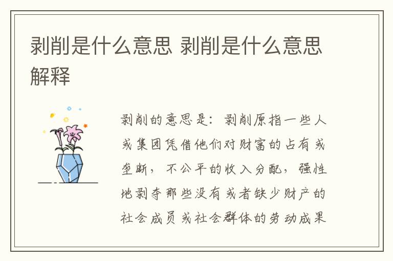 剥削的意思是:剥削原指一些人或集团凭借他们对财富的占有或垄断,不公平的收入分配,强性地剥夺那些没有或者缺少财产的社会成员或社会群体的劳动成果和个人财产,也就是富人侵吞穷人的财产。现指使用他人劳动力而不给予公平的或相当的报酬。