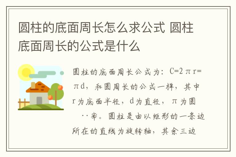 圆柱的底面周长公式为:C=2πr=πd,和圆周长的公式一样,其中r为底面半径,d为直径,π为圆周率。