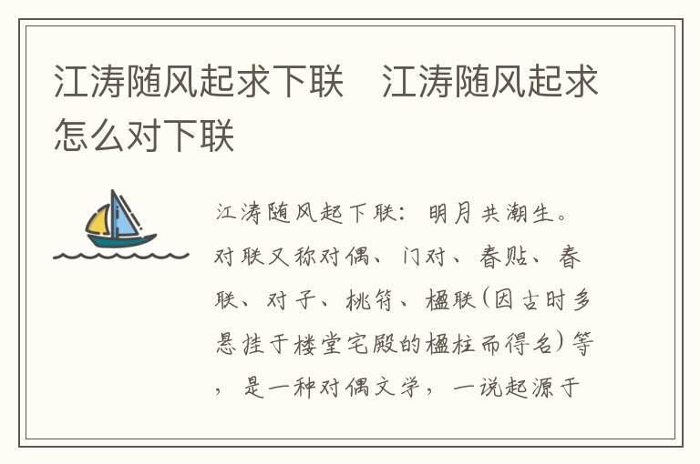 江涛随风起下联:明月共潮生。对联又称对偶、门对、春贴、春联、对子、桃符、楹联(因古时多悬挂于楼堂宅殿的楹柱而得名)等,是一种对偶文学,一说起源于桃符。另一来源是春贴,古人在立春日多贴“宜春”二字,后渐渐发展为春联,表达了中国劳动人民一种辟邪除灾、迎祥纳福的美好愿望。对联是写在纸、布上或刻在竹子、木头、柱子上的对偶语句。
