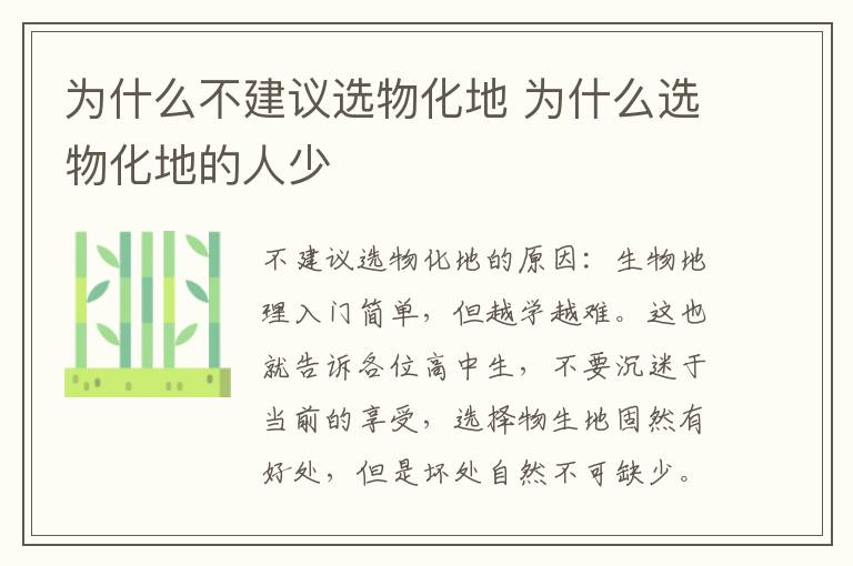 不建议选物化地的原因:生物地理入门简单,但越学越难。这也就告诉各位高中生,不要沉迷于当前的享受,选择物生地固然有好处,但是坏处自然不可缺少。客观来看:地理生物上课简单,很容易听懂,但是为了区分三六九等,试卷难度会增加。化学物理上课迷糊,可能听不太懂,但是试卷的基础题会比较多。至于政治和历史,就是要看考生的记忆力,理解力和分析能力。
