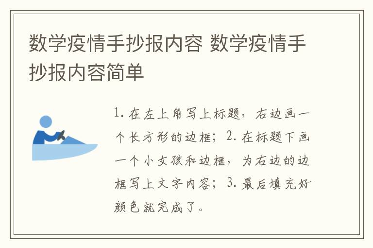 数学疫情手抄报内容 数学疫情手抄报内容简单 知识分享 3月10日 编辑 童画 取消关注 关注 私信 1.在左上角写上标题,右边画一个长方形的边框; 2.在标题下画一个小女孩和边框,为右边的边框写上文字内容; 3.最后填充好颜色就完成了。 No related posts. 本文内容由互联网用户自发贡献,该文观点仅代表作者本人。本站仅提供信息存储空间服务,不拥有所有权,不承担相关法律责任。如发现本站有涉嫌抄袭侵权/违法违规的内容, 请发送邮件至 2245678901@qq.com 举报,一经查实,本站将立刻删除。 给TA打赏 共{{data.count}}人 人已打赏