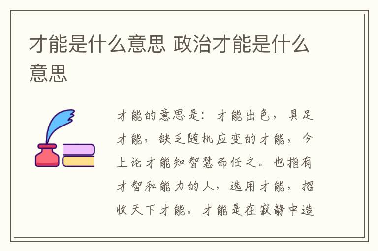 才能的意思是:才能出色|具足才能|缺乏随机应变的才能|今上论才能知智慧而任之。也指有才智和能力的人,选用才能,招收天下才能。才能是在寂静中造就,而品格则是在世间汹涌波涛中形成。在世界的前进中起作用的不是我们的才能,而是我们如何运用才能。