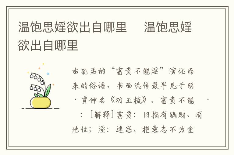 由孔孟的“富贵不能淫”演化而来的俗语,书面流传最早见于明·贾仲名《对玉梳》。富贵不能淫:[解释]富贵:旧指有钱财、有地位;淫:迷惑。指意志不为金钱和地位所迷惑。[来源]《孟子·滕文公下》:“富贵不能淫,贫贱不能移,威武不能屈,此之谓大丈夫。”温饱思婬欲出自哪里 温饱思婬欲出自哪里
