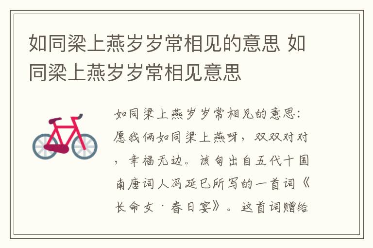 如同梁上燕岁岁常相见的意思:愿我俩如同梁上燕呀,双双对对,幸福无边。该句出自五代十国南唐词人冯延巳所写的一首词《长命女·春日宴》。这首词赠给丈夫,表达了一个贤淑妻子对丈夫的忠贞和“岁岁长相见”的真挚愿望。该词语言清新明丽,通俗易懂却能够表达最真挚的感情。