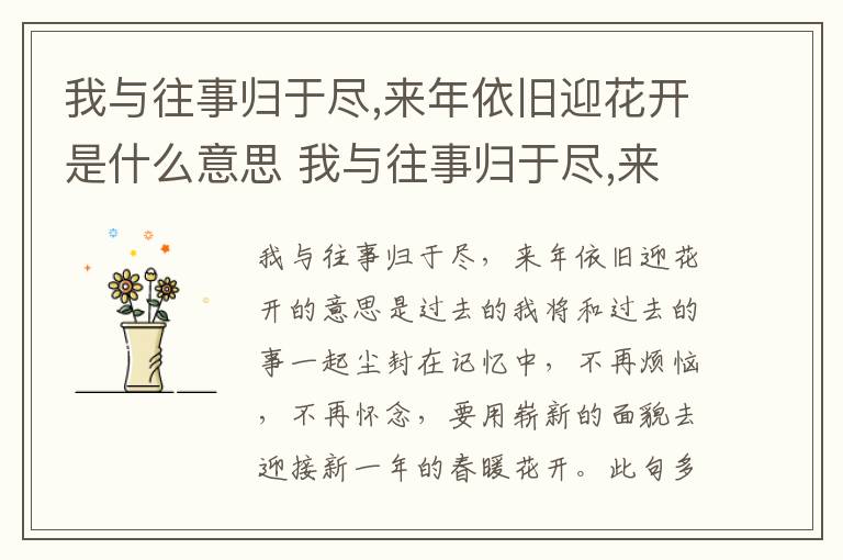 我与往事归于尽,来年依旧迎花开的意思是过去的我将和过去的事一起尘封在记忆中,不再烦恼,不再怀念,要用崭新的面貌去迎接新一年的春暖花开。此句多用于辞旧迎新之季,表达对新的开始的展望。告诫我们不要执着于过去的事情,要为了以后更美好的生活而努力。
