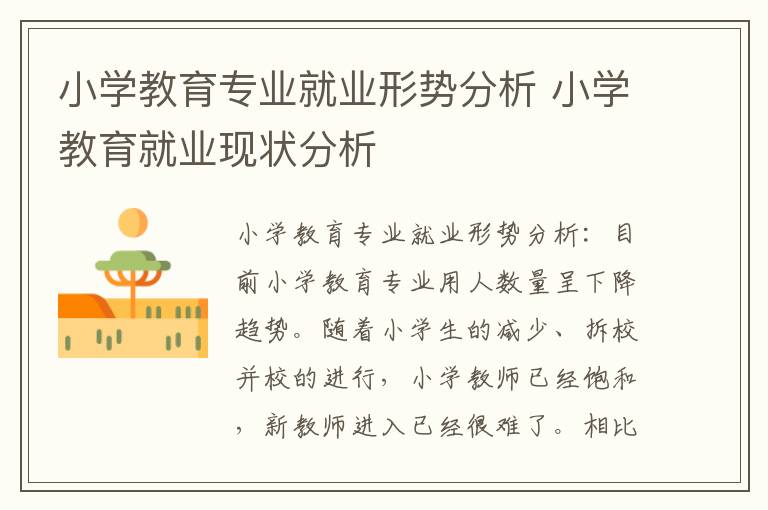 小学教育专业就业形势分析:目前小学教育专业用人数量呈下降趋势。随着小学生的减少、拆校并校的进行,小学教师已经饱和,新教师进入已经很难了。相比教育培训机构,学校的工作更稳定。学校有公办和民办之分。公办学校的教师工作压力较小,工作稳定,福利也很好。因为有编制,所以是国家发工资,在退休养老方面也会更有保障,适合喜欢安定生活的人。