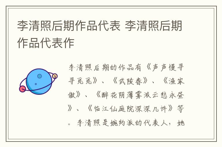 李清照后期的作品有《声声慢寻寻觅觅》、《武陵春》、《渔家傲》、《醉花阴薄雾浓云愁永昼》、《临江仙庭院深深几许》等。李清照是婉约派的代表人,她的词风多变,通过对景色和人物的描写和刻画,引发世人的深思。她后期的词风压抑沉闷,抒发了自己离乡愁绪之苦。