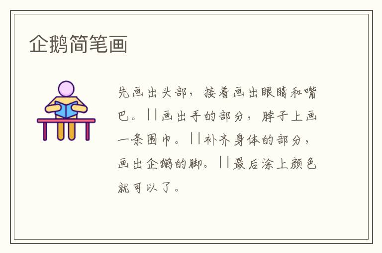 企鹅简笔画 知识分享 3月23日 编辑 童画 取消关注 关注 私信 1、先画出头部,接着画出眼睛和嘴巴。 2、画出手的部分,脖子上画一条围巾。 3、补齐身体的部分,画出企鹅的脚。 4、最后涂上颜色就可以了。 No related posts. 本文内容由互联网用户自发贡献,该文观点仅代表作者本人。本站仅提供信息存储空间服务,不拥有所有权,不承担相关法律责任。如发现本站有涉嫌抄袭侵权/违法违规的内容, 请发送邮件至 2245678901@qq.com 举报,一经查实,本站将立刻删除。 给TA打赏 共{{data.count}}人 人已打赏