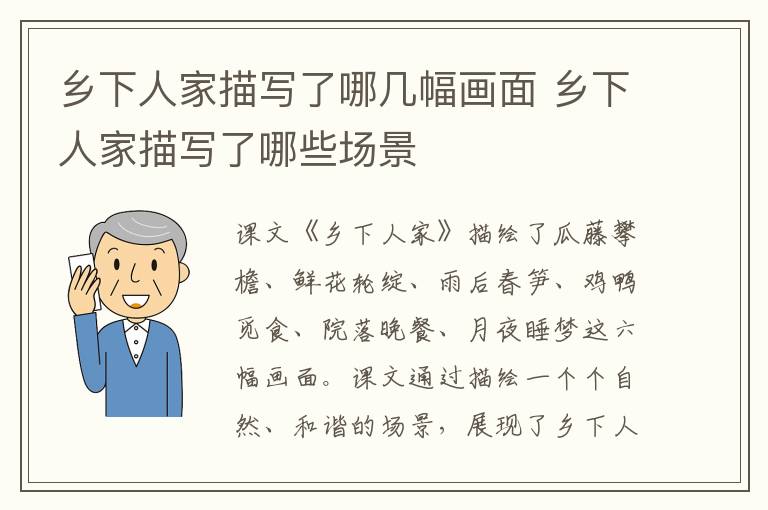 课文《乡下人家》描绘了瓜藤攀檐、鲜花轮绽、雨后春笋、鸡鸭觅食、院落晚餐、月夜睡梦这六幅画面。课文通过描绘一个个自然、和谐的场景,展现了乡下人家朴实自然和谐、充满诗意的乡村生活,也赞扬了乡下人家热爱生活、善于用自己勤劳的双手装点自己的家园、装点自己生活的美好品质。