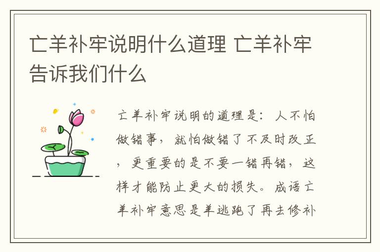 亡羊补牢说明的道理是:人不怕做错事,就怕做错了不及时改正,更重要的是不要一错再错,这样才能防止更大的损失。成语亡羊补牢意思是羊逃跑了再去修补羊圈,还不算晚,比喻出了问题以后想办法补救,免得以后继续受损失。出自《战国策·楚策》:“见兔而顾犬,未为晚也;亡羊而补牢,未为迟也。”