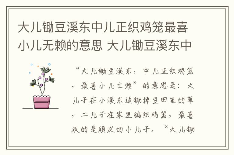 “大儿锄豆溪东,中儿正织鸡笼,最喜小儿亡赖”的意思是:大儿子在小溪东边锄掉豆田里的草,二儿子在家里编织鸡笼,最喜欢的是顽皮的小儿子。“大儿锄豆溪东,中儿正织鸡笼,最喜小儿亡赖”出自宋代词人辛弃疾的《清平乐·村居》。
