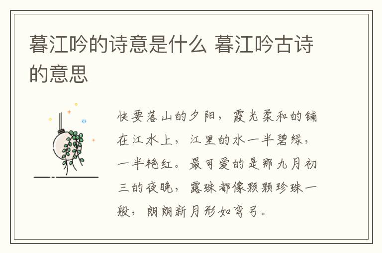 快要落山的夕阳,霞光柔和的铺在江水上,江里的水一半碧绿,一半艳红。最可爱的是那九月初三的夜晚,露珠都像颗颗珍珠一般,朗朗新月形如弯弓。