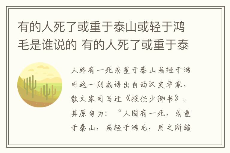人终有一死或重于泰山或轻于鸿毛这一则成语出自西汉史学家、散文家司马迁《报任少卿书》。其原句为:“人固有一死,或重于泰山,或轻于鸿毛,用之所趋异。”