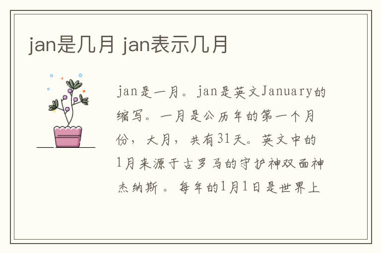 jan是几月 jan表示几月 知识分享 3月23日 编辑 童画 取消关注 关注 私信 jan是一月。jan是英文January的缩写。一月是公历年的第一个月份,大月,共有31天。 英文中的1月来源于古罗马的守护神双面神杰纳斯 。每年的1月1日是世界上许多国家的新年,中国称为元旦,标志着新一年的到来 。在这一天,西方国家会举行各种庆祝活动迎接新年的到来 。我国有的地方在元旦的前夜会举行跨年活动 。 No related posts. 本文内容由互联网用户自发贡献,该文观点仅代表作者本人。本站仅提供信息存储空间服务,不拥有所有权,不承担相关法律责任。如发现本站有涉嫌抄袭侵权/违法违规的内容, 请发送邮件至 2245678901@qq.com 举报,一经查实,本站将立刻删除。 给TA打赏 共{{data.count}}人 人已打赏