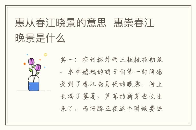 这两首诗是苏轼题在惠崇所画的《春江晓景》上的。惠崇原画已失,这首诗有的版本题作《春江晓景》,现已无从考证。这首题画诗既保留了画面的形象美,也发挥了诗的长处。诗人用他饶有风味、虚实相间的笔墨,将原画所描绘的春色展现得那样令人神往。在根据画面进行描写的同时,苏轼又有新的构思,从而使得画中的优美形象更富有诗的感情和引人入胜的意境。