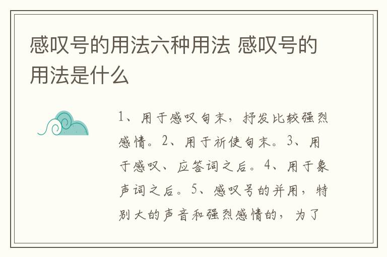 1、用于感叹,句末使用;2、用于祈使,语气强烈、坚决、感情激奋的句末要用叹号;3、用于感叹、应答词之后;4、用于象声词之后;5、感叹号的并用;6、与问号连用。