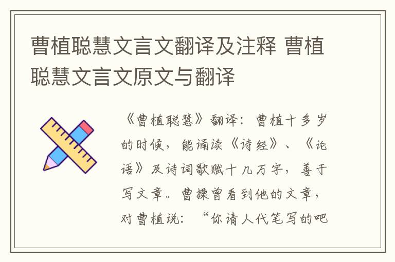 《曹植聪慧》翻译:曹植十多岁的时候,能诵读《诗经》、《论语》及诗词歌赋十几万字,善于写文章。曹操曾看到他的文章,对曹植说:“你请人代笔写的吧?”曹植跪拜回答说:“话说出来是言论,落笔写下来成文章了,您只要当面考我,我怎么会请人代笔写呢?”注释:赋:古代的一种文体。