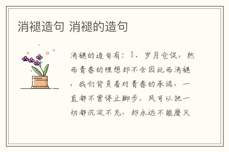 消褪的造句有:1、岁月仓促,然而青春的理想却不会因此而消褪,我们背负着对青春的承诺,一直都不曾停止脚步。风可以把一切都沉淀不见,却永远不能磨灭青春追梦的心。2、时光宛若流水,玫瑰的颜色并不消褪。3、她为它的颜色感到震撼,中间是深红的,然后慢慢消褪成黄色。