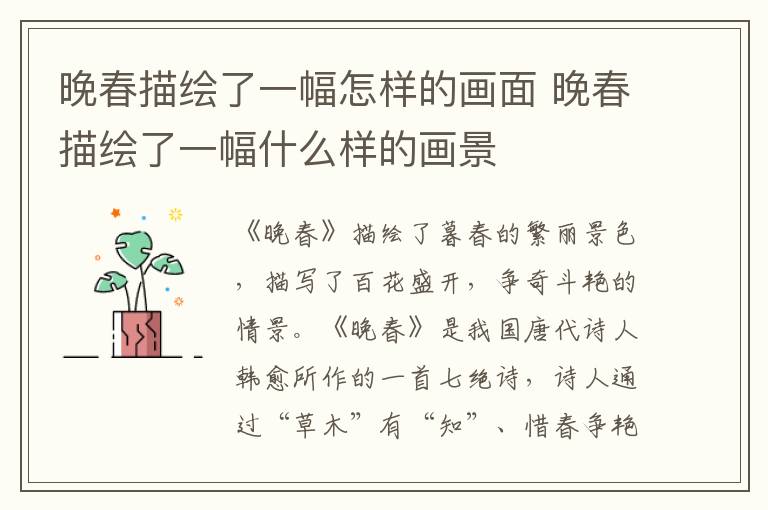 《晚春》描绘了暮春的繁丽景色,描写了百花盛开,争奇斗艳的情景。《晚春》是我国唐代诗人韩愈所作的一首七绝诗,诗人通过“草木”有“知”、惜春争艳的场景描写,反映出自己对春天大好风光的珍惜之情。