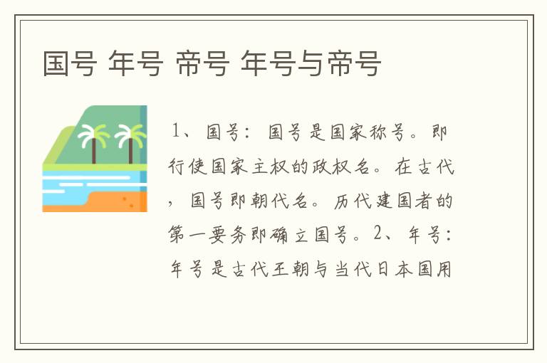 1、国号:国号是国家称号。即行使国家主权的政权名。在古代,国号即朝代名。历代建国者的第一要务即确立国号。2、年号:年号是古代王朝与当代日本国用来纪年的一种名号。一般由君主发起。先秦至汉初无年号,汉武帝即位后首创年号。始创年号为建元。此后形成制度。3、帝号:帝号指的是皇帝的称号。
