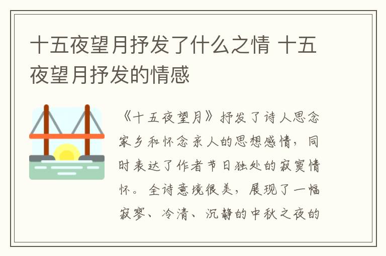 《十五夜望月》抒发了诗人思念家乡和怀念亲人的思想感情,同时表达了作者节日独处的寂寞情怀。全诗意境很美,展现了一幅寂寥、冷清、沉静的中秋之夜的图画。