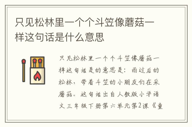 只见松林里一个个斗笠像蘑菇一样这句话是的意思是:雨过后的松林,带着斗笠的小朋友们在采蘑菇。这句话出自人教版小学语文三年级下册第六单元第2课《童年的水墨画》。这首诗表现了孩子们童年生活的快乐《溪边》钓鱼的孩子,那样的快乐,静静的溪水映着爱美的柳树,映着钓鱼孩子的倒影。