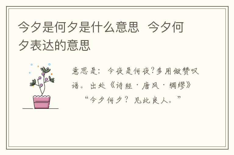 意思是:今夜是何夜?多用做赞叹语,指此是良辰。出处《诗经·唐风·绸缪》:“今夕何夕?见此良人。”