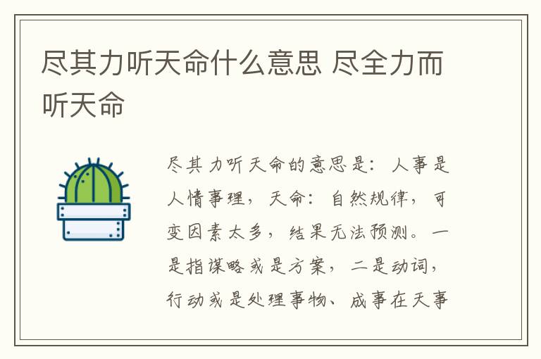 尽其力听天命的意思是1、语出自李汝珍·《镜花缘》第六回“尽人事以听天命”。人事:人情事理;天命:自然规律,可变因素太多,结果无法预测。2、《镜花缘》是清代文人李汝珍创作的长篇小说。小说前半部分描写了唐敖、多九公等人乘船在海外游历的故事,包括他们在女儿国、君子国、无肠国等国的经历史。后半部写了武则天科举选才女,由百花仙子托生的唐小山及其他各花仙子托生的一百位才女考中,并在朝中有所作为的故事。其神幻诙谐的创作手法数经据典,奇妙地勾画出一幅绚丽斑斓的天轮彩图。