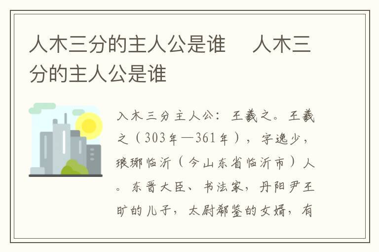 入木三分主人公:王羲之。王羲之(303年—361年),字逸少,琅琊临沂(今山东省临沂市)人。东晋大臣、书法家,丹阳尹王旷的儿子,太尉郗鉴的女婿,有“书圣”之称。王羲之(303年—361年),字逸少,琅琊临沂(今山东省临沂市)人。东晋大臣、书法家,丹阳尹王旷的儿子,太尉郗鉴的女婿,有“书圣”之称。