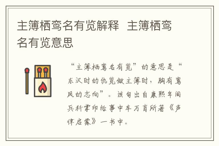 “主簿栖鸾名有览”的意思是“东汉时的仇览做主簿时,胸有鸾凤的志向”。该句出自康熙年间兵科掌印给事中车万育所著《声律启蒙》一书中。《声律启蒙》是训练儿童应对、掌握声韵格律的启蒙读物。按韵分编,包罗天文地理、花木鸟兽等虚实应对。从单字对到到十一字对,声韵协调,琅琅上口,从中得到语音、词汇、修辞的训练。“主簿栖鸾名有览”则出自该书上卷“三江”一对中。